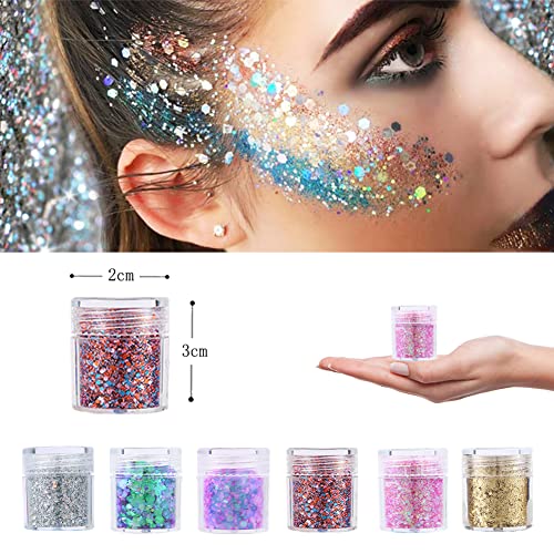 - 【2022 & Hot Glitter Set】Very nice glitter! The different sized glitter particles are particularly great. Contains six beautiful colors, the colors are strong and due to the different sizes of the glitter particles, it shines much more beautifully and powerfully than other glitter. The hexagon shape is really chic, looks like fish scales on the face.