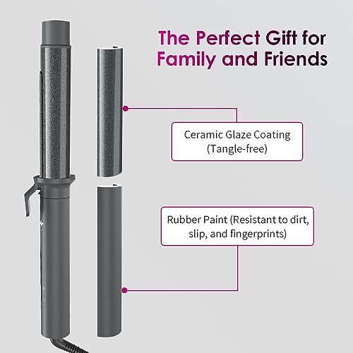- [The Perfect Gift] The handle of the hair curlers is coated with a soft and delicate rubber paint, providing you with an excellent grip while also being resistant to dirt, slip, and fingerprints. The heating barrel and clamp are coated with nano-ceramic oil, having a mirror-like surface that cleverly prevents hair from tangling,which make the hair smooth and shiny. With appealing aesthetics, it is the ideal choice for gifting.