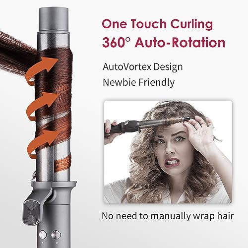 - [One Touch Curling,No Skill Needed] The new generation automatic curling iron adopts AutoVortex design enables the curling tongs to rotate automatically. Simply clamp a strand of hair and gently press the rotation button, Our design wraps hair in two seconds and achieve stunning curls in 15 minutes.