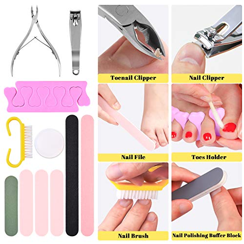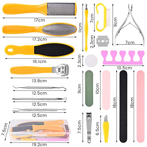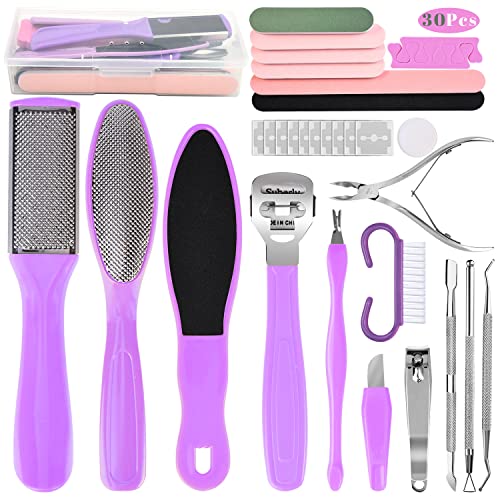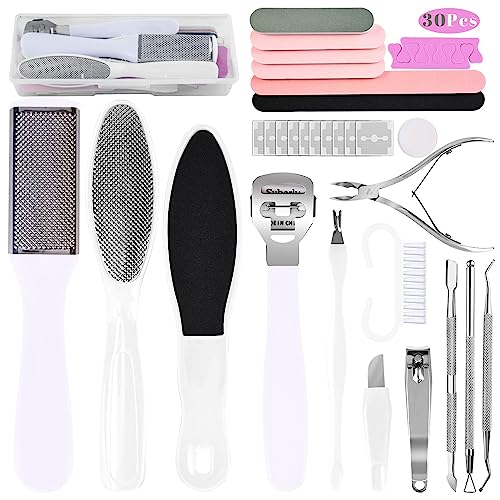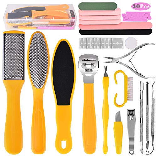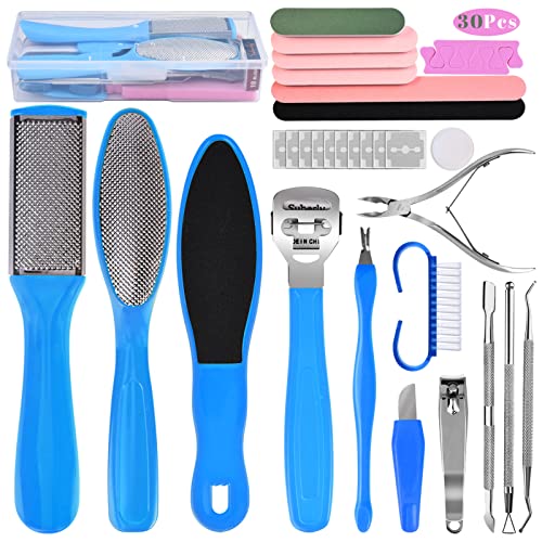 - 【30 in 1 Foot Care Kit】- Manicure and pedicure set contains 30pcs pedicure tools, including 3pcs foot rasps, 1pcs callus shaver, 10pcs blades, 1pcs cuticle pusher, 1pcs ingrown toenail lifter, 1pcs cuticle peeler, 2pcs toes holder, 1pcs nail polishing buffer block, 1pcs nail clipper, 5pcs nail file, 1pcs toenail clipper, 1pcs clear silicone pad, 1pcs dead skin fork, 1pcs corn knife and 1pcs storage box