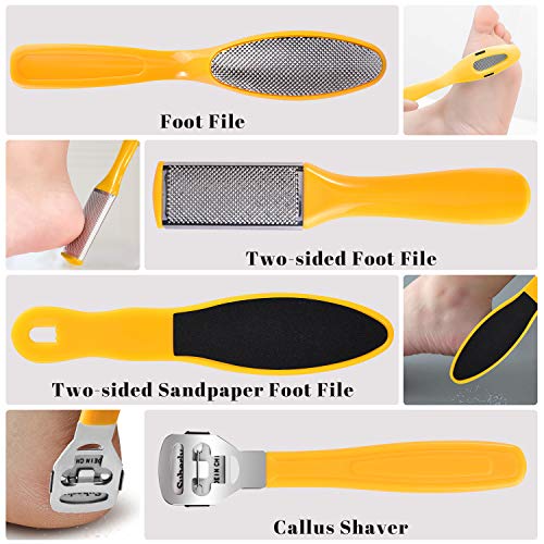 - 【Ergonomic Design】- Each tool of the professional pedicure kit is designed for special function to help people remove dead skin, calluses and hardened skin on the heels and feet as well as other areas where rough skin appears