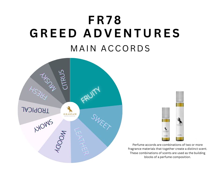FR78 GREED ADVENTURES perfume oil for men. 6ml roll-on bottle. Arabian Opulence. Fruity/woody/sweet/leather/smoky. A crowd pleasing masterpiece