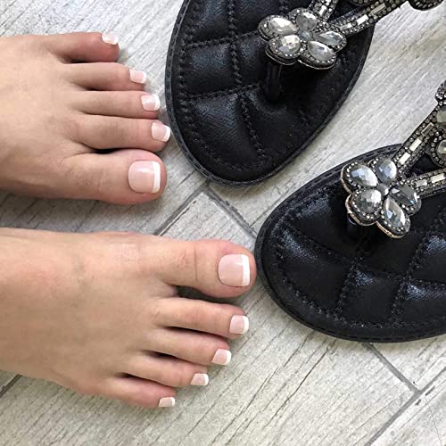 - 【Easy to Use】: Just gently polish your toe nails, file the sides and cuticle area with a nail file for an accurate fit and clean the dust. 2 kinds of ways to wear, apply glue or jelly adhesive on the nail, then select the right size of press on toenails for each toenail, put on the false toe nails and press on them for 25s.Then you will get a nature and beautiful french manicure.