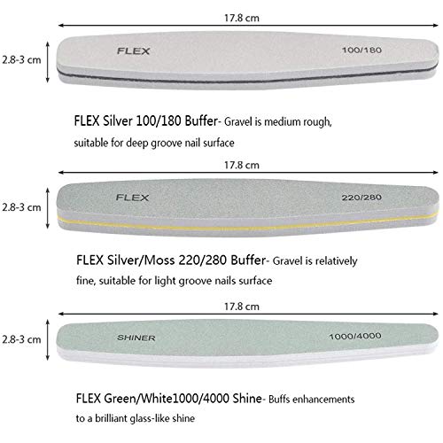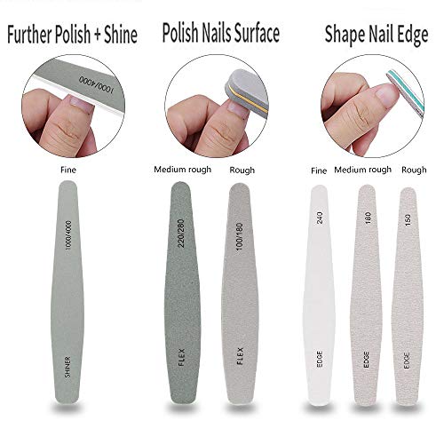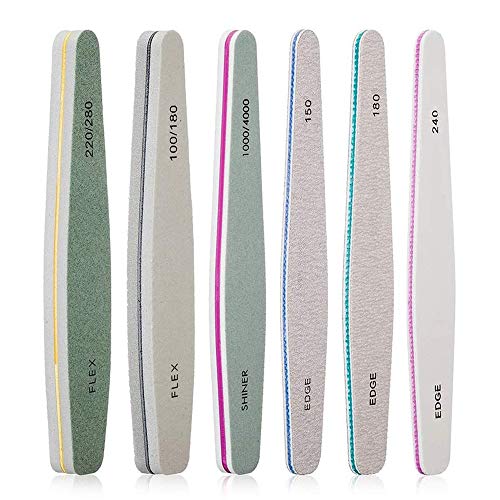 - 6 Professional Nail Files: This set of nail files has different grits in a set of 150, 180, 240, 100/180, 220/280, 1000/4000, each marked with a grain number for different effects. Ideal for false nails and natural nails.