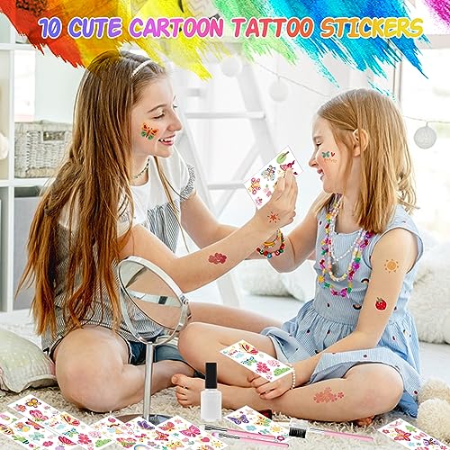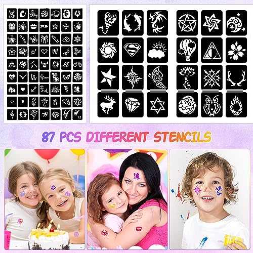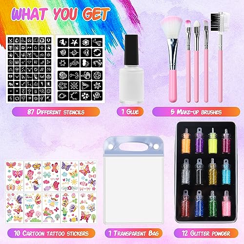 Geitiet Glitter Tattoos for Kids,Temporary Glitter Tattoos Kit for Kids,12 Colours Glitter, 87Stencils, 5 Brushes, 1 Glues, 10 tattoo stickers fo