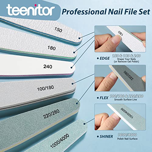 - Complete Gel Polish Remover Kit for Manicure & Pedicure: Package include 1 set teenitor professional nail files set(6pcs), 20pcs gel nail remover clips(10pcs fingernail clip +10pcs toe nail clip), 500pcs lint free wipe pads, 1pcs nail buffer block, 1pcs nail brush, 1pcs nail polish remover pump bottle(Empty bottle capacity: 100ml), 1pcs cuticle clipper, 1pcs cuticle peeler, 1pcs cuticle pusher, 1pcs toenail lifter and 1pc stainless steel nail file(especial for toe)