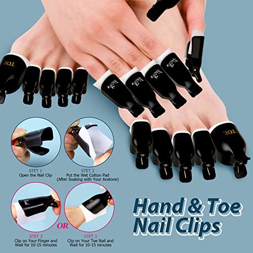 - Simple 5 Steps to Help Remove Nail Polish: We provide both finger and toe acrylic nail remover clip for removing nail polish or gel, simple 5 steps to finish- first, use 150 grit to remove top layer; second, wet cotton pad by your acetone(acetone is not included); third, put the wet cotton pad on nail clip then clip and wait for 10-15 minutes; fourth, use cuticle peeler to remove nail gel polish; fifth, polish nail surface by 1000/4000 grit nail shiner