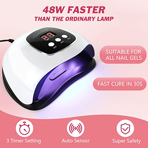 - 【MODIFIED 48W LAMP】- High power can efficiently cure all kinds of gel nail polish with 3 timer setting auto sensor for fingernail (30s/60s/90s), dual light source design, 24 psc LED beads, Non-harmful to eyes and Non-blacken to skin. Suitable for almost all nail gels
