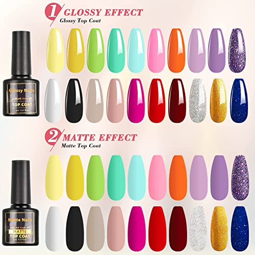 - 20+3 GEL NAIL POLISHES COLOURS SET: 20 gorgeous colors nail gel polish (8ml/0.27oz each) +3 no wipe base coat and glossy & matte top coat (8ml/0.27oz each); The beautiful and trendy gel polish colors include white, black, red, pink, nude, glitter, lavender, turquoise, yellow etc. Glam and classic gel nail polish set designs can be freely finished with vibrant gel polish, bring you brilliant shine finish, attractive appearance and creative art nails, color variety and look fabulous on your nails.