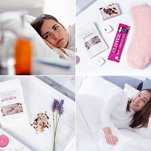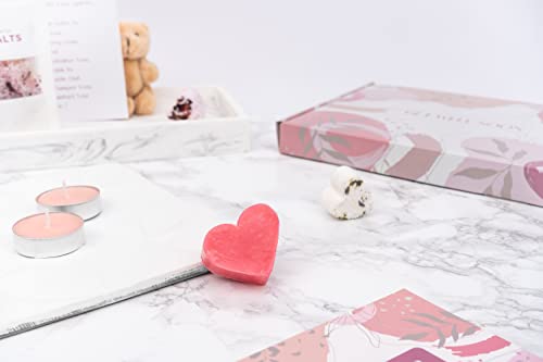 FULL CONTENTS: 1 teddy, 1 sachet bath salts, 1 pair pink socks, 1 sachet hot chocolate, 2 mini bath bombs, 1 heart soap, 2 tealights, and gift note.
