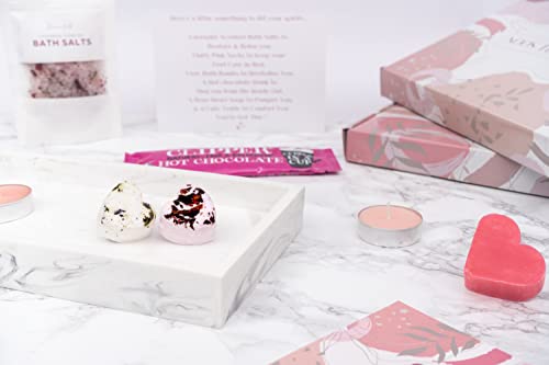 Our “Get well soon” box is for women who are unwell and it’s designed to give them the warm-and-fuzzies. There’s a tiny ted, lavender bath salts (with essential oils to aid rest and restoration), a single-serve hot chocolate (fair trade), soft pink socks, two little bath bombs, a heart-shaped soap, and 2 rose-pink tealights. It’s a slender box that pops straight onto the doormat – so the recipient won’t even have to open the door.