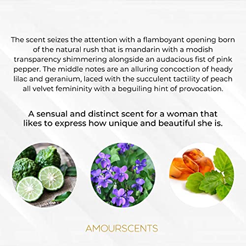 - FRESH AND SENSUAL - The scent seizes the attention with a flamboyant opening born of the natural rush that is mandarin imbued with a modish transparency shimmering alongside an audacious fist of pink pepper. The middle notes are an alluring concoction of heady lilac and geranium, laced with the succulent tactility of peach all velvet femininity with a beguiling hint of provocation.