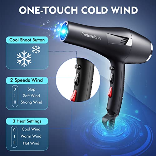 HappyGoo,Black Professional Hair Dryer 2400W AC Motor Fast Drying Salon Ionic Hairdryer with 2 Speed, 3 Heat Setting, Cool Button, with Diffuser,