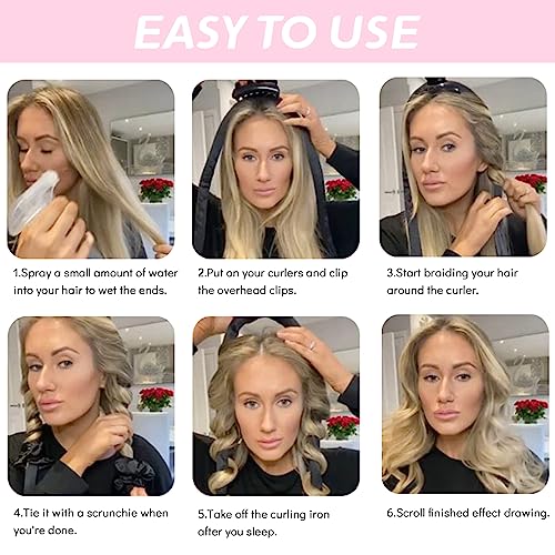 - 【Easy to Use】Spray a small amount of water on the hair to wet the ends of the hair, put on the Hair Roller and clamp the clip on the top of the head, start braiding the hair around the curling iron, fix it with a hair tie after the braiding, and remove it after sleeping Get soft wavy hair.
