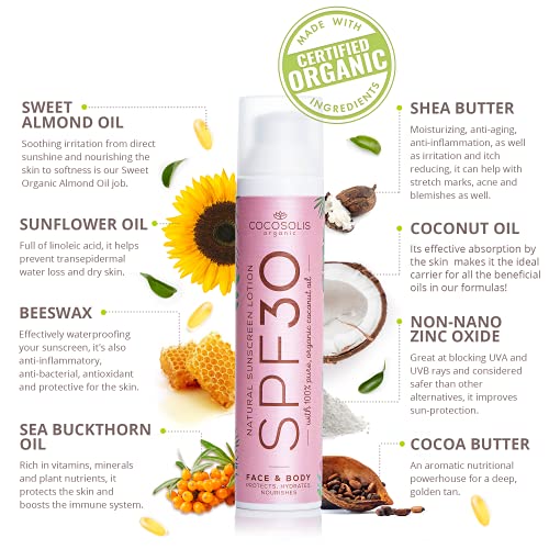 - 🌸LIGHT SKIN-FRIENDLY TEXTURE: Cocosolis broad-spectrum SUN CREAM SPF 30 is lightweight, blends well and gives a good sunblock performance. The sun cream can double as a moisturizer, since it comes with a mineral pink tint, which brightens up the complexion. May stain clothes.