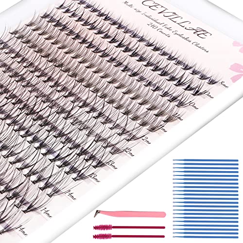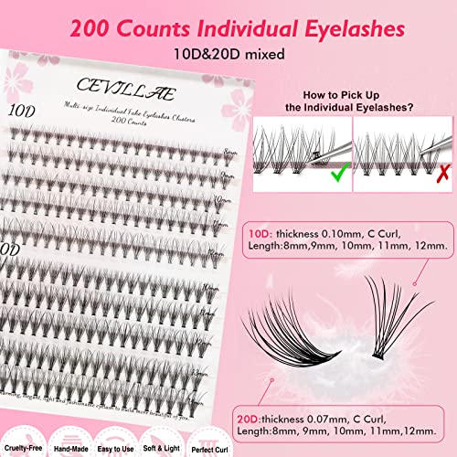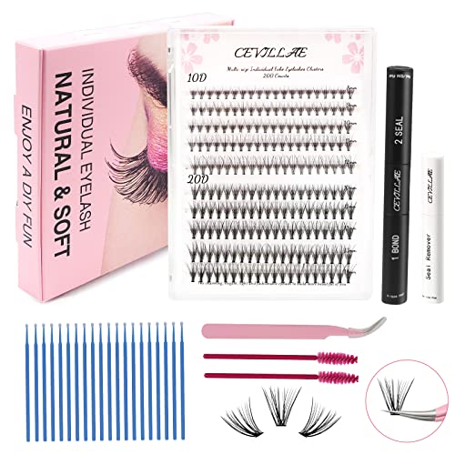 - 【200Counts Individual Lashes Extension Kit】- The Cevillae DIY Eyelash Extension Kit includes 200pcs lashes Clusters(100pcs 10D and 100pcs 20D), 10D mixed length 8-12mm,20D mixed length 10-14mm. 1x Bond&Seal Glue, 1xSeal Remover, 1xTweezer,2xEyelash Brush,20xmascara brush. Compare to the normal individual lashes, our false eyelash extension kit is more economical, you don't need to buy the eyelash glue separately, Cevillae individual lashes set is money-saving and time-saving and deserve to you.