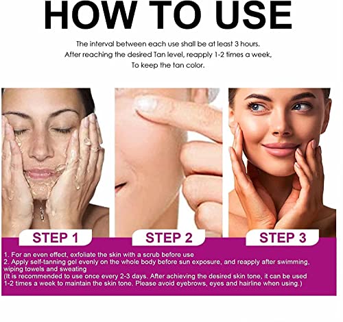 - 【Easy to Use】: You only need to apply the tanning cream on your skin, massage it in order to absorb it, and then bathe in the sun to enjoy a natural bronze tan! (Tip: It is recommended to use with your regular sunscreen to ensure proper sun protection. Avoid exposure to the midday sun.)