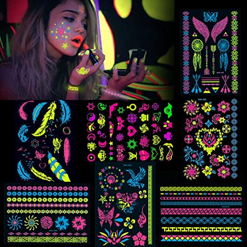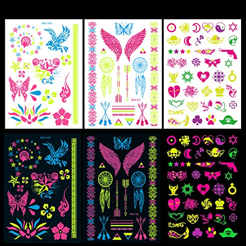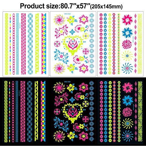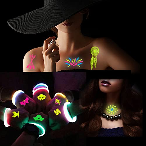 - 7 Large sheets Glow UV Neon temporary tattoos, over 100 tattoos in all. Include arrows, star, feathers, flowers, bracelets, armbands and other patterns, Tattoos glow under UV Lighting/Blacklights!