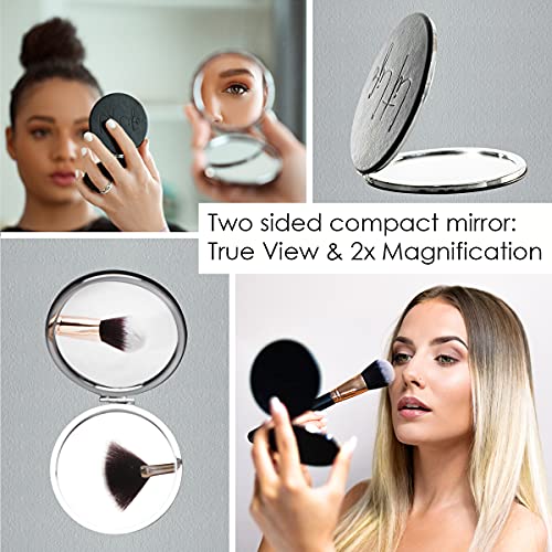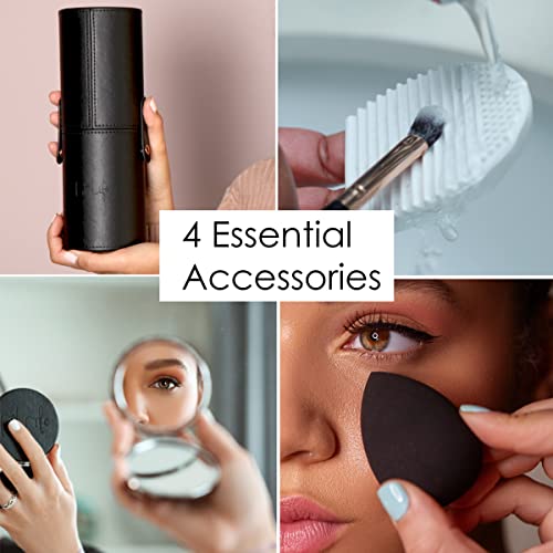 - Complete tool kit: Your flawless set also includes a Professional high quality makeup brush holder designed as both a makeup brush organiser and a makeup brush travel case to keep your brushes clean, organized and dust free. A strong durable and easy to use makeup brush cleaner crafted to easily remove dirt and grime form Makeup brushes of any size. A lush stylish, matte black luxury vegan leather compact mirror. A perfect addition to any purse or handbag.
