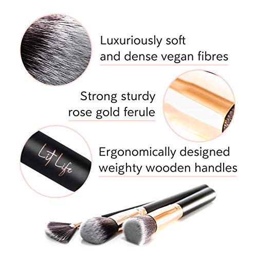 - Complete set: The Lit Life Flawless set includes 12 professional must have face and eye makeup brushes including powder, blush, concealer, eyeshadow, eyeliner, eyebrow, spoolie, foundation kabuki, highlighter, fan and more. Designed to give you all the essential tools to create your perfect flawless look.