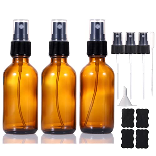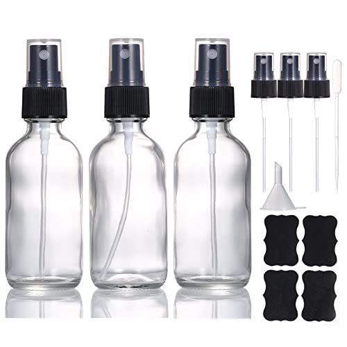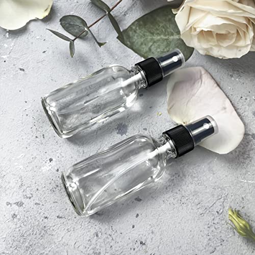 - GREAT VALUE - This clear glass bottle set comes with 60ml Clear glass spray bottle x 2, Black mist sprayer x 4, Funnel x 1, Dropper x 1, Label x4.