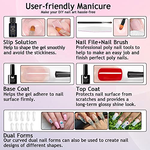 • 【All-in-one Nail Extension Kit】The package included 2*15ml poly nail gel,1*clear color+1*natural pink color,1*15ml base coat,1*15ml top coat,1*40ml slip solution,60PCS dual forms,1*nail brush,1*nail file, (Notice:Requires a nail lamp to cure which is not contained in the kit)