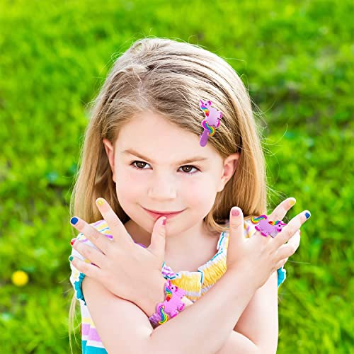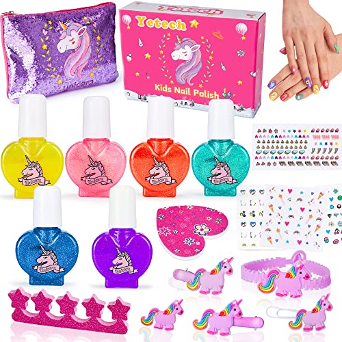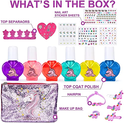 - 🦄【Perfect Nail Polish Set】This set contains 6 bottles of glitter nail polish: purple, pink, red, yellow, green, blue. It also contains a unicorn hair cord, 3 unicorn hairpins, 1 unicorn ring, a finger separator, a nail rubbing strip, 4 nail stickers, and a unicorn makeup bag. Various nail designs can be obtained through different combinations that help stimulate children's creativity and imagination.
