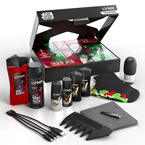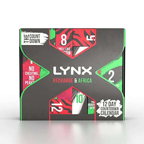 • LYNX Africa & Recharge Countdown Calendar Gift Set includes 2 full-size and 4 travel-size LYNX products plus 6 Christmas gifts for him, packaged in 12 individual gift boxes