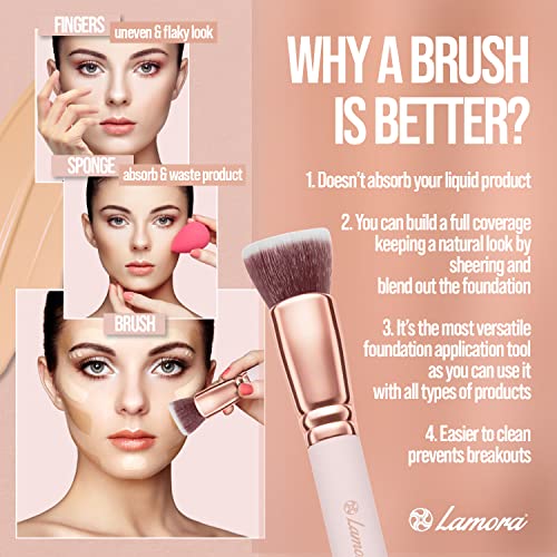 - The Lamora FLAT KABUKI brush is a professional foundation brush that everyone can afford. It comes with high quality synthetic bristles and a black wooden handle. Use this makeup brush as a powder or stippling brush to apply powder, cream and liquid products onto the skin without trapping or absorption of product. It does not soak up excessive amounts of product like other makeup brushes.