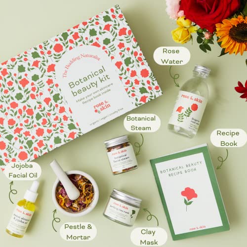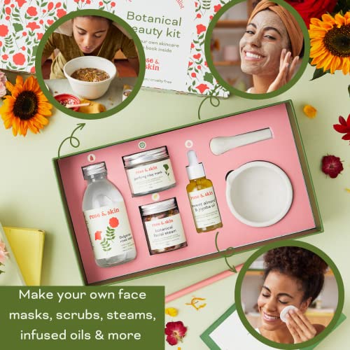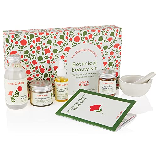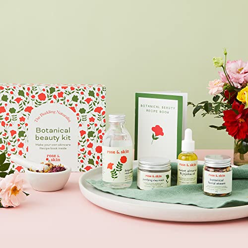 • What is included? 1x Organic Rose Water (150 ml), 1x Sweet Almond and Jojoba Oil (30 ml), Botanical Facial Steam (60 g), Clays and Superfoods Mask (60 g), Pestle and Mortar, Recipe book with over 30 recipes for homemade skincare & beauty.