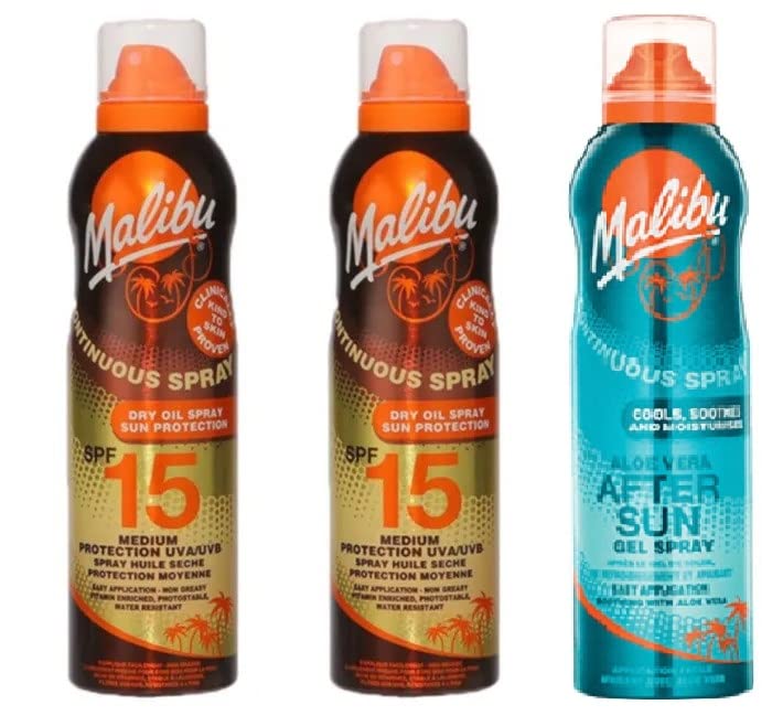 Malibu Aerosol Continuous Dry Oil Sprays SPF 15 Sun Proterction Cream +Aloe Vera Aftersun Gel Spray 175ml Each 3 Pack