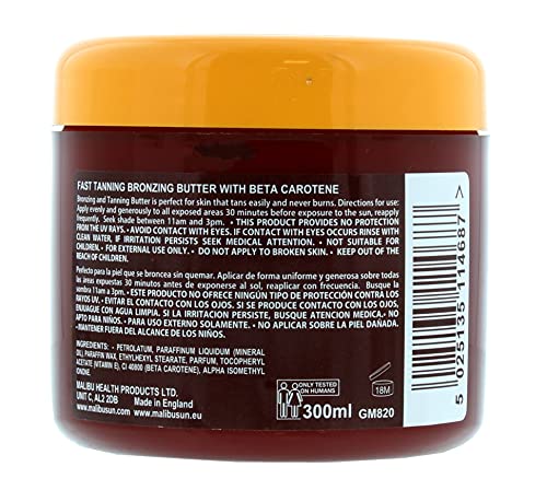 - Bronze and Glow: Rapidly build a bronzed glowing tan with Malibu’s Beta Carotene moisturising Body Butter