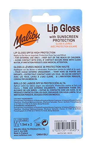 Malibu Sun SPF 30 Sunscreen Lip Gloss, High Protection, Water and Wind Resistant, Coconut and Strawberry, Pack of 2 x 1.5ml Malibu Sun SPF 30 Sunscreen Lip Gloss, High Protection, Water and Wind Resistant, Coconut and Strawberry, Pack of 2 x 1.5ml