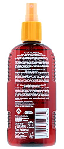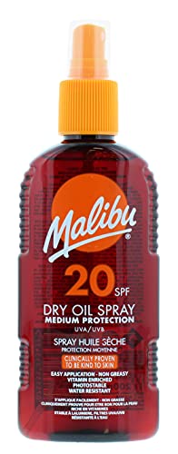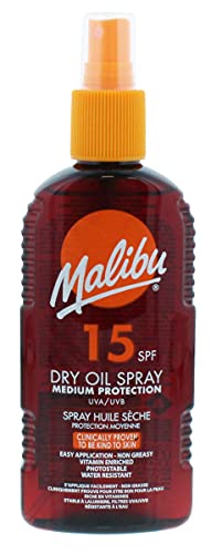 - Bronze and protect: Build a bronzed glowing tan with Malibu’s dry oil tanning spray. Protect your skin against harmful and damaging UV rays with a high SPF factor 50