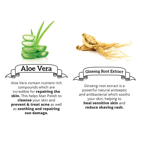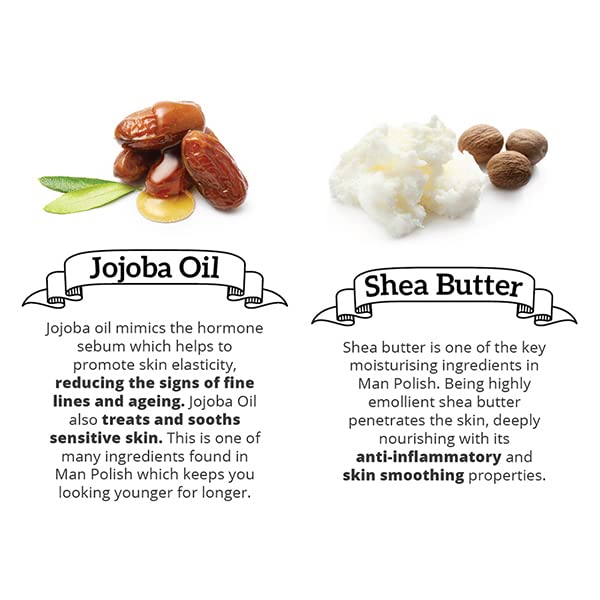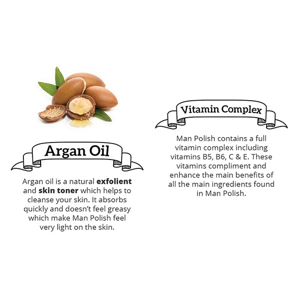 - Perfect for sensitive skin. Man Polish is made using high quality natural oils such as Jojoba Oil, Argan Oil, Ginseng Root Extract, Aloe Vera, Shea Butter, and a full vitamin complex which help with your skin’s elasticity, replenishment and health.
