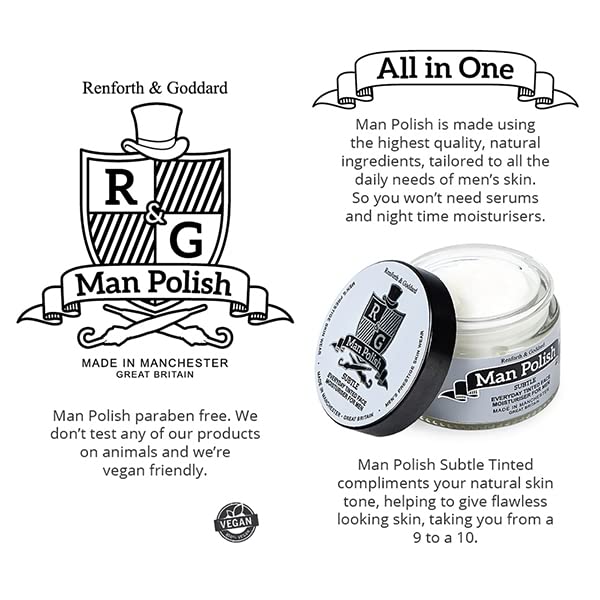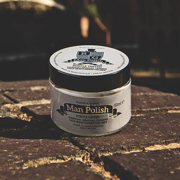 - Not like make-up. Man Polish Subtle Tinted contains a gradual tanning agent which adds a healthy colour to your skin all year round, helping to disguise blemishes and give you handsome looking skin no matter your skin tone, without the dangers of a sun bed. Some say it takes them from a 9 to a 10.