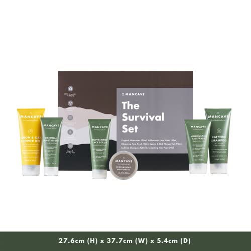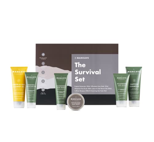 - COMPLETE GROOMING SURVIVAL SET: The ManCave Survival Set is the ultimate grooming kit for the modern man. It includes a range of high-quality products to cleanse, nourish, and style your hair, beard, and skin, ensuring you're always ready to look your best. Included in this set: Lemon & Oak Shower Gel 200ml, Caffeine Shampoo 200ml, Willowbark Face Wash 125ml, Original Moisturiser 100ml, Olivestone Face Scrub 100ml and Texturising Hair paste 75ml