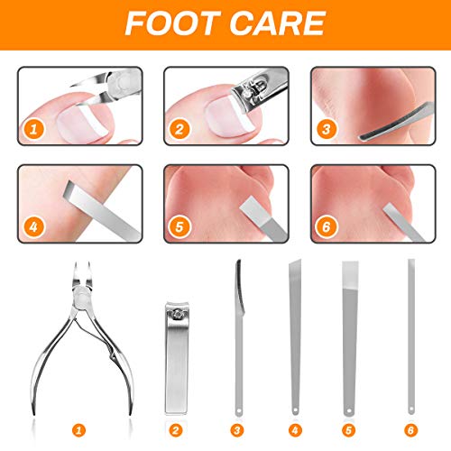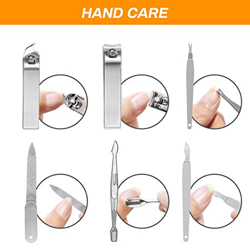• 【Multi-Purpose Manicure Set】The 21 pcs manicure set includes toenail clipper, nail clipper, diagonal nail clipper, multi-purpose scissor, cuticle trimmer, ear pick, single-edged double-sided push stick, eyebrow tweezer, nail file, blackhead needle and loop remover etc, can meet your need for hand care, facial care and foot care. No need to pay for a single nail clippers or nose hair scissors, money can be saved.