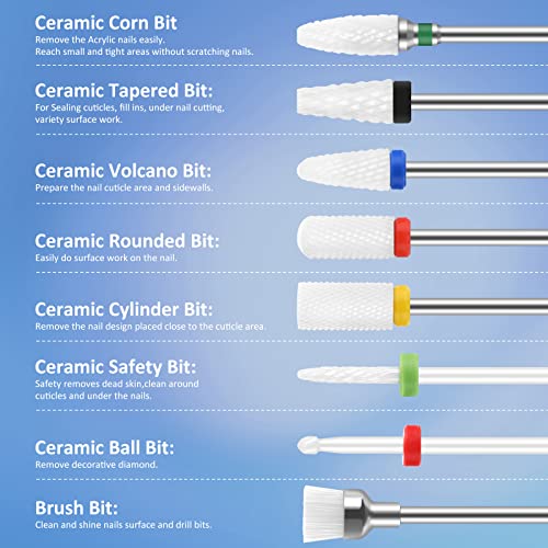 - Premium Ceramic Material:These nail art tools are made of premium ceramic material, durable, sharp and durable. With excellent heat dissipation, the bits will not burn hot like metal parts when used for a long time. Ceramics can be cleaned and sterilized and never rust. They could generate less dust with little friction and heat when using
