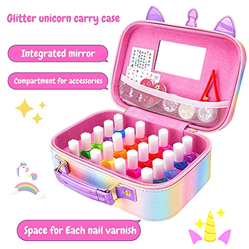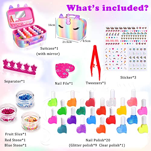 - ❤30PCS NAIL POLISHES & ACCESSORIES - This lovely kids nail set comes with Unicorn Suitcase*1 ,Nail polish*20,Nail stickers*3,Nail separator*1,Nail file*1,Teezer*1,Fruit Slices*1 ,Nail Glitter*2.