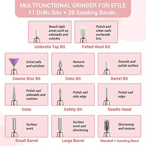 - Nail drill set accessories: comes with 11 nail drill bits and 26 #180 sanding bands; 1 cleaning brush and nail clippers set