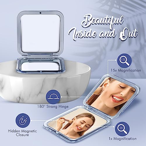 MIRRORVANA Small Compact 15X Magnifying Mirror for Travel - Handheld, Foldable & Very Lightweight - Mini Pocket-Sized Magnified Mirror for Purse