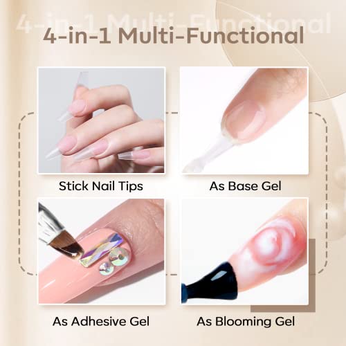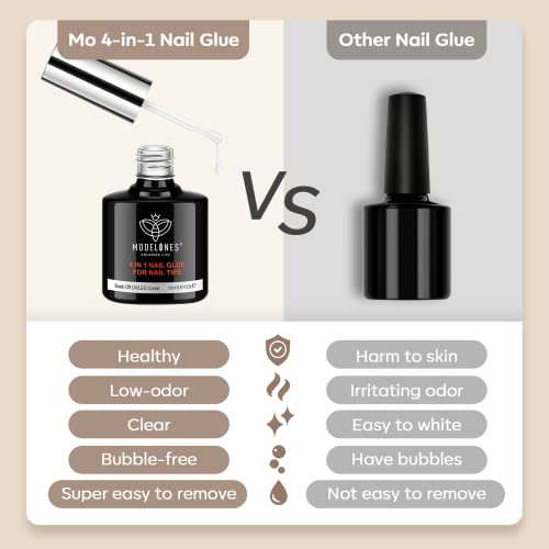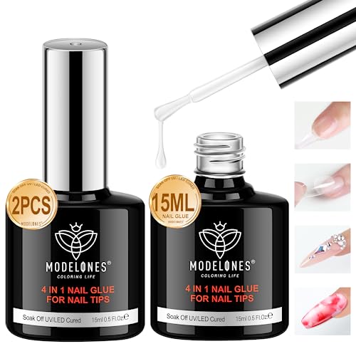 - 🔥 Professional Gel Polish 4 in 1 Nail Glue:Modelones nail glue sets include 2 pieces of 15ML 4 in 1 uv nail glue gel. It can be used for acrylic nails (Strong nail glue for broken nails). It also can be used as base coat gel, blooming gel polish and adhesive gel for rhinestone.