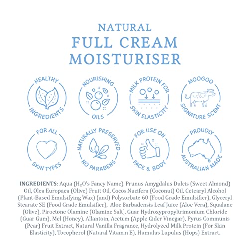 - SIMPLER, HEALTHIER CONDITIONERS: MooGoo's Natural Full Cream Moisturizer uses naturally nourishing ingredients like milk protein, sweet almond, and coconut to nourish and repair dried out, damaged, or irritated sensitive skin while hydrating the face and body.