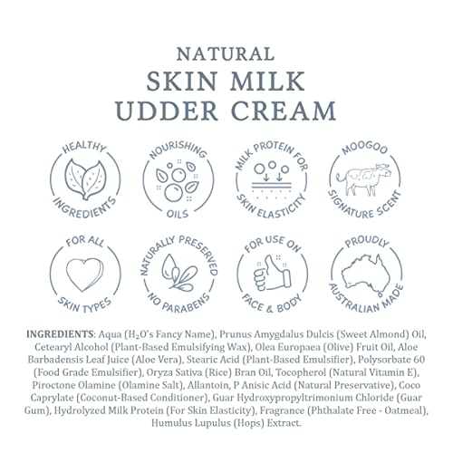 - SIMPLER, HEALTHIER CONDITIONERS: MooGoo's Natural Skin Milk Udder Cream Moisturizer uses naturally nourishing ingredients like milk protein, aloe vera, and vitamin e to nourish skin and increase elasticity while hydrating the face and body.