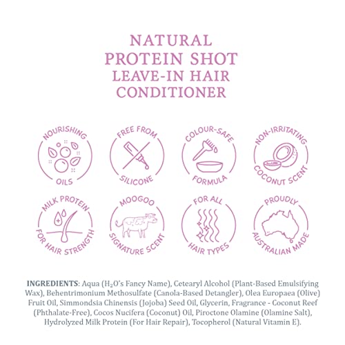 - SIMPLER, HEALTHIER CONDITIONERS: MooGoo's Protein Shot Leave-In Hair Conditioner uses naturally nourishing oils to hydrate, detangle, repair and strengthen hair. Milk protein protects hair fibres for more resilient hair. Helps protect the hair for heat styling and nourish colour treated hair.