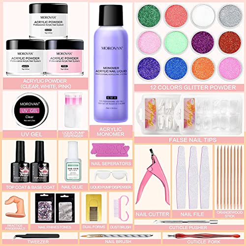 - 💝MOROVAN ACRYLIC NAIL KIT: The professional acrylic nail kit comes with everything you need to do acrylic nails, acrylic powder in 3 colors, 12 colors of glitter powders, gel top base coat, nail tips and other basic nail art tools, ideal for both professional nail technician and DIY nail starter lover.