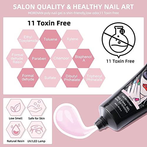 - 🎀HEALTH & NATURAL NAIL DESIGN: Morovan Poly Gel Nail Extensions are safe for your nails and skin, poly nail gel have a low odor. poly nail gel also no irritating ingredients and adhesives that can damage the nails, providing highly pigmented and smooth shiny nail extensions.