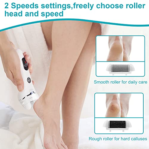 • 【Electric Foot Rasps with Interchangeable Rollers & Two Speeds】 This foot care tool is equipped with 2 rollers: The coarse roller to remove calluses and corns, the fine roller to remove dead skin; 1st speed: gentle mode for people with dead or sensitive skin; 2nd speed: powerful mode for people with stubborn thick calluses or horny skin. The roll can be easily removed with a simple press of the side button.