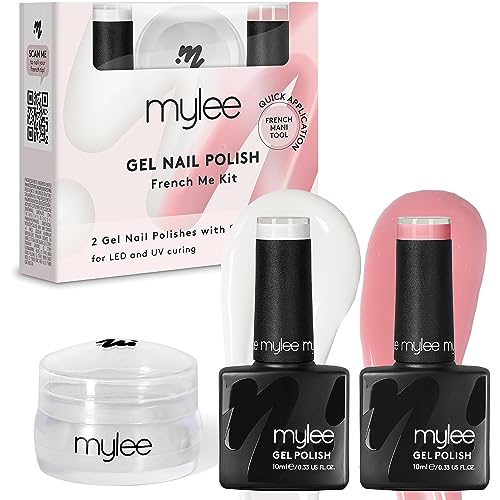 - Easy French mani hack – Achieve flawless French manis with this easy peasy kit! It includes everything you need to achieve salon-quality results at home, from two Mylee gel polishes, to a nifty stamping tool. No more struggling with uneven tips or extra charges at the salon